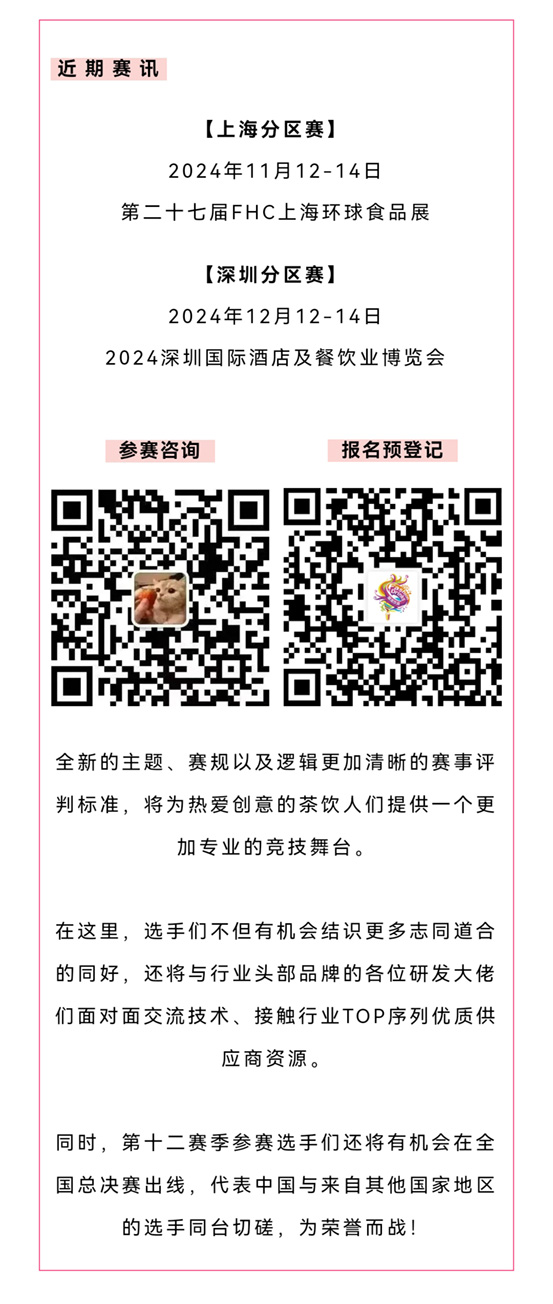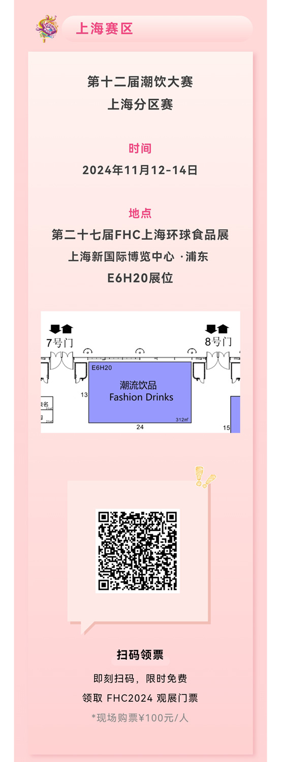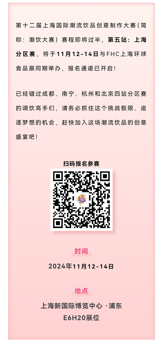 潮飲大賽~賽程即將過(guò)半,第五站:上海分區(qū)賽,將于11月12-14日與FHC上海環(huán)球食品展同期舉辦,報(bào)名通道已開(kāi)啟!