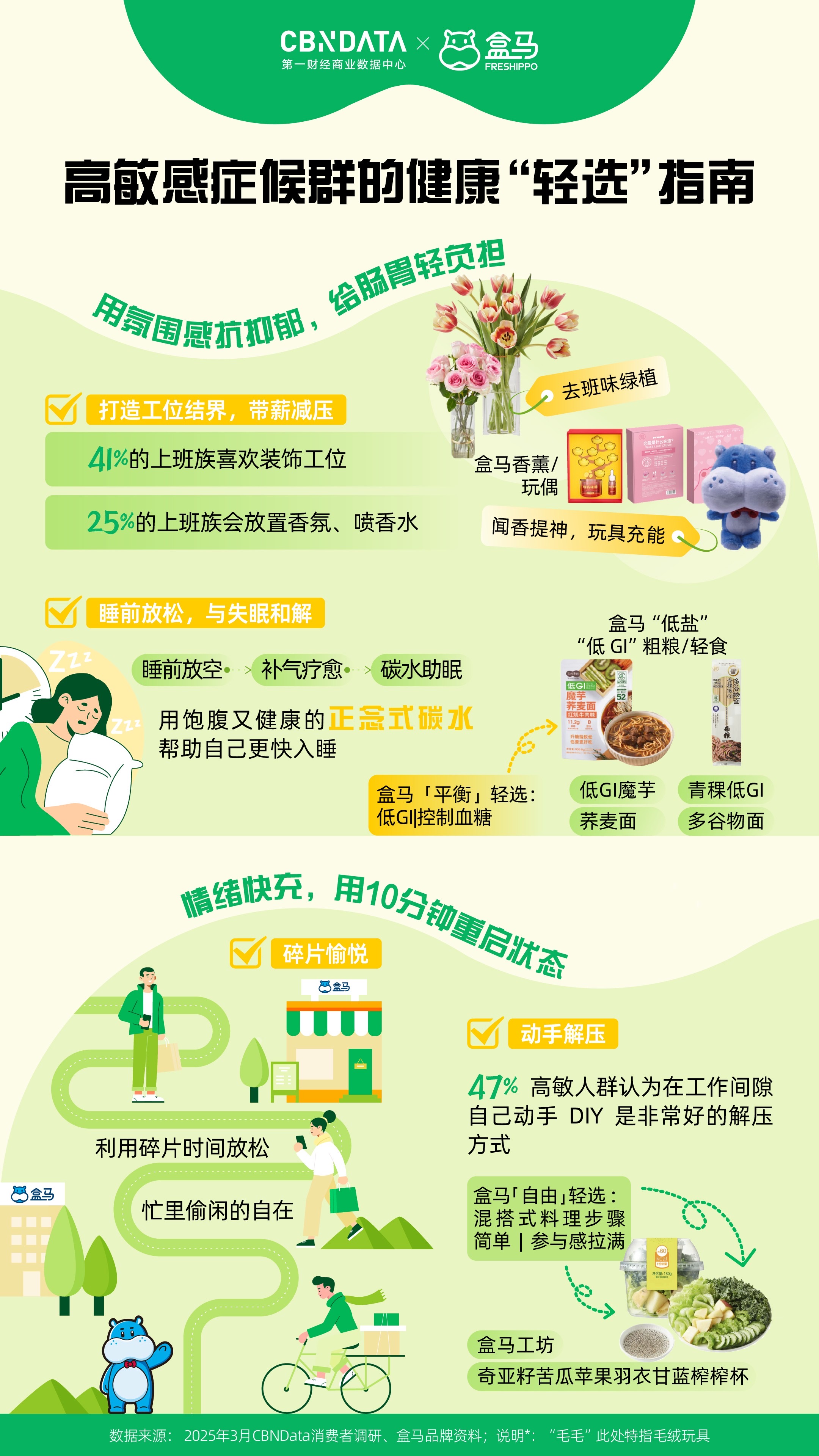 面對這些挑戰(zhàn),高敏感打工人開始在工位上帶薪“解壓”。從 “放青松”、“禁止蕉慮”等去班味綠植,到解乏治愈型香薰,職場“碌”人用視覺、嗅覺和觸覺體驗(yàn)建起“情緒緩沖帶”。而回到家中卸下一身疲憊,低落的心情需要低GI食物來挽救。針對此,盒馬推出藥食同源袋泡茶和低鹽低GI粗糧,既能快速飽腹,又能控制血糖穩(wěn)定,幫助高敏感職場人更快入睡。