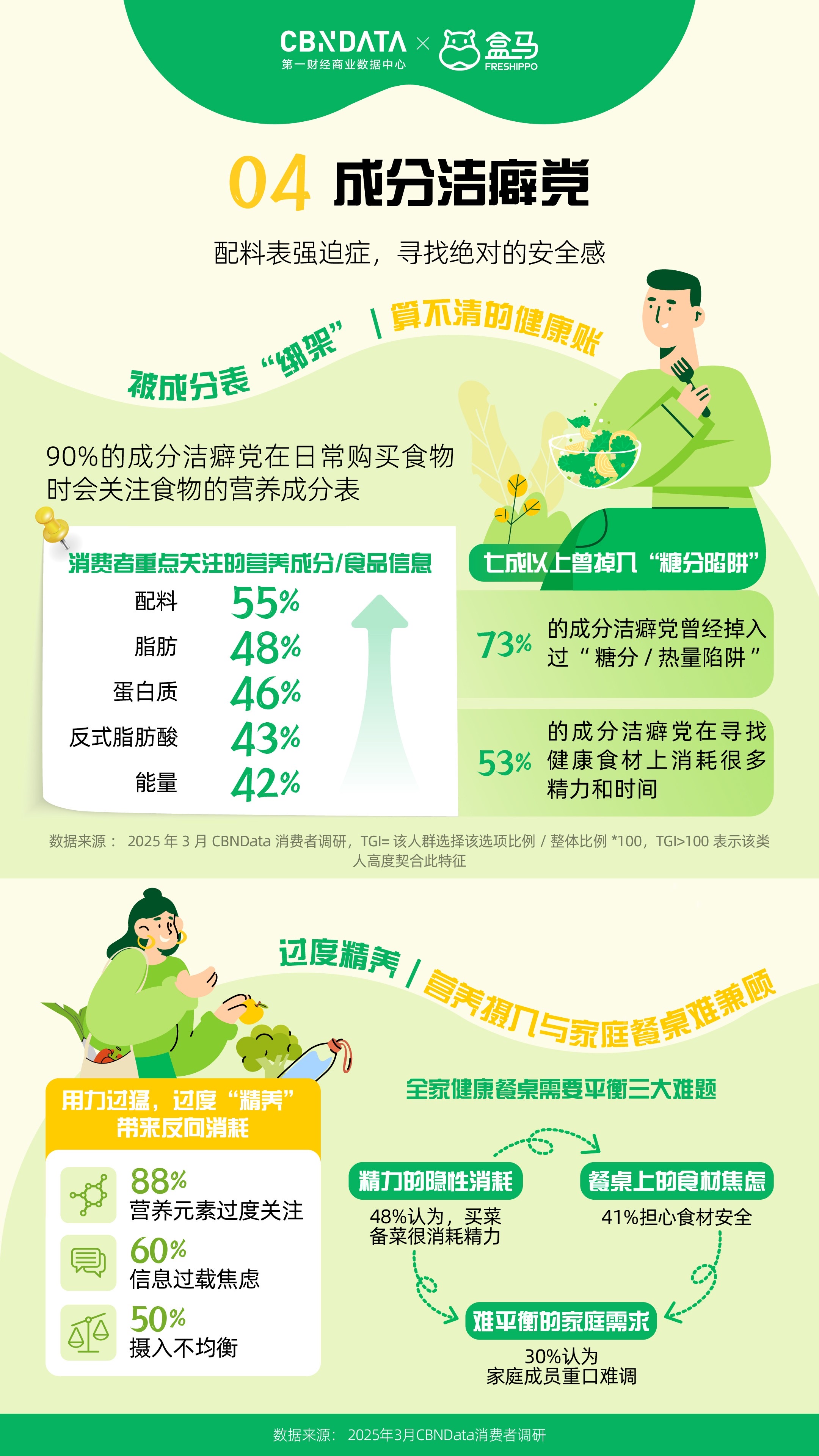 然而,即便消費(fèi)者如此謹(jǐn)慎,也依然會掉入以健康為名義的陷阱。比如,標(biāo)簽顯示的“0糖”并不等于無糖,為了保持甜味,許多“0糖”食品會添加阿斯巴甜、赤蘚糖醇等代糖。此外,人工添加劑和食材來源的不透明,使得日常篩選健康飲食成為一件耗費(fèi)精力的事情。特別是對那些家庭成員較多的成分黨而言,既要兼顧口味又要保證營養(yǎng),接近一半的成分族表示在家做飯時(shí)買菜、備菜很耗費(fèi)精力,41%的成分黨擔(dān)心食材健康,如農(nóng)藥殘留和過量添加劑等。