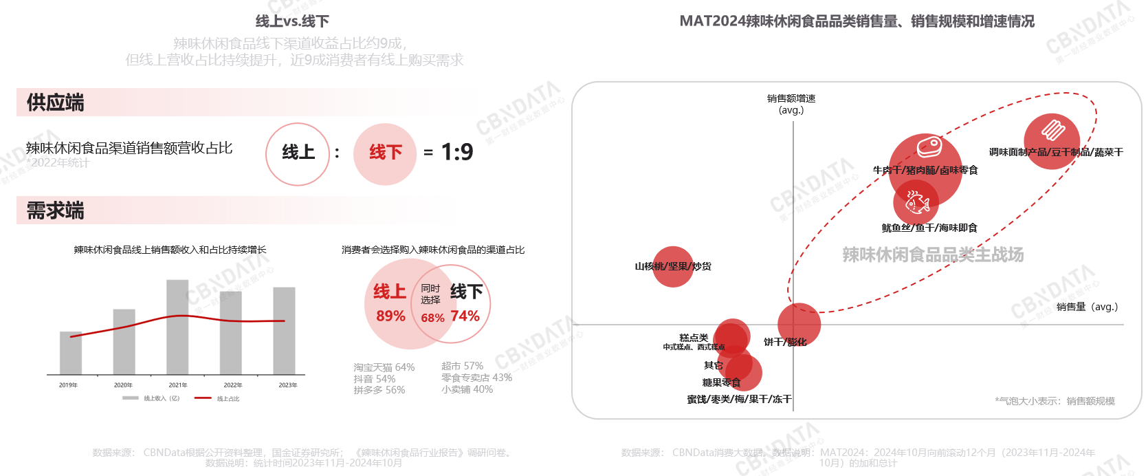 《報(bào)告》數(shù)據(jù)顯示,辣味休閑食品已經(jīng)形成完整的品類市場格局,線下渠道仍占據(jù)主導(dǎo)地位,線上消費(fèi)潛力亟待挖掘。此外,面制豆蔬制品、肉類制品和膨化食品是辣味休閑食品的品類主戰(zhàn)場。