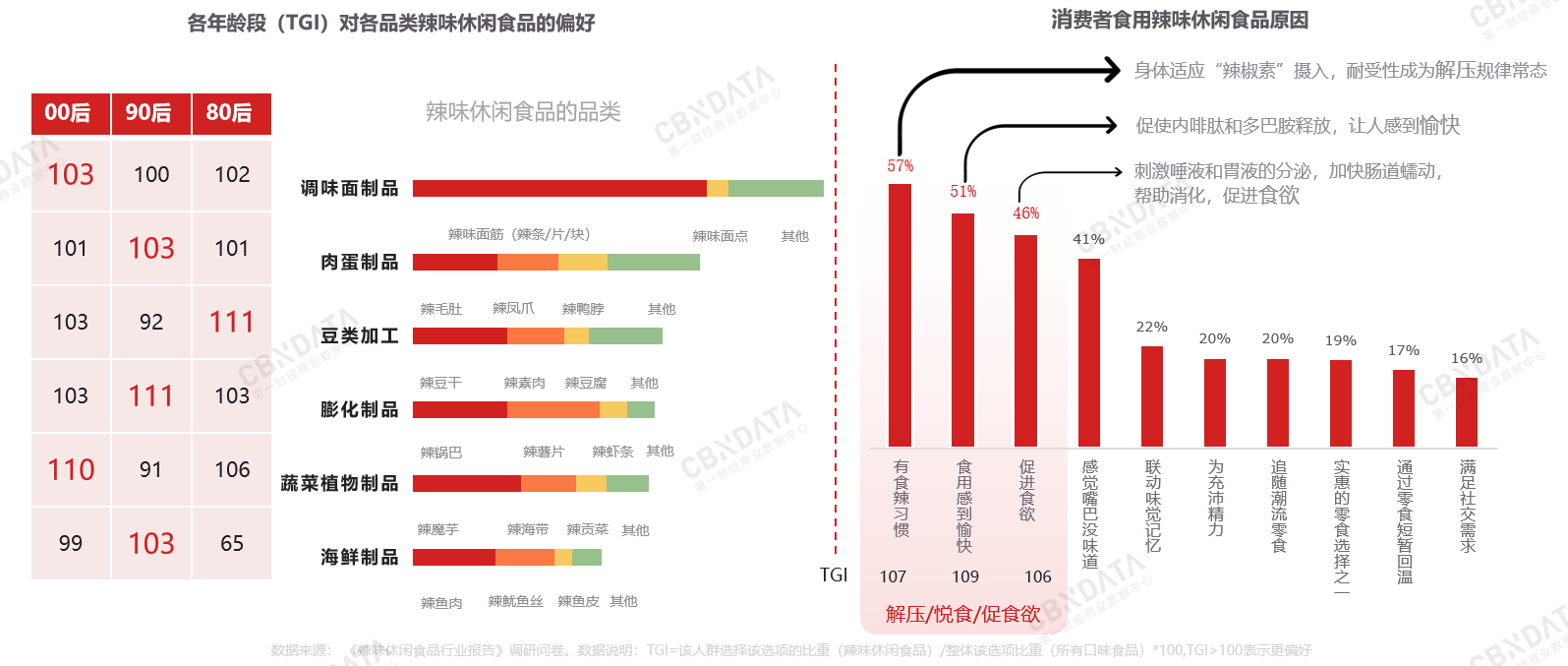首先,不同年齡段的消費(fèi)者對辣味零食的偏好存在明顯差異,00后群體傾向調(diào)味面制品及魔芋、海帶等蔬菜植物基產(chǎn)品,90后偏好肉蛋、海鮮及膨化類耐飽腹辣味零食。盡管品類選擇存在代際差異,但消費(fèi)動(dòng)機(jī)呈現(xiàn)高度共性?!俺岳苯鈮骸焙汀袄备袔淼挠鋹傮w驗(yàn)”成為主要的情緒動(dòng)因,另有46%的受訪人群更看重吃辣帶來的促進(jìn)消化、增強(qiáng)食欲的實(shí)際效用。