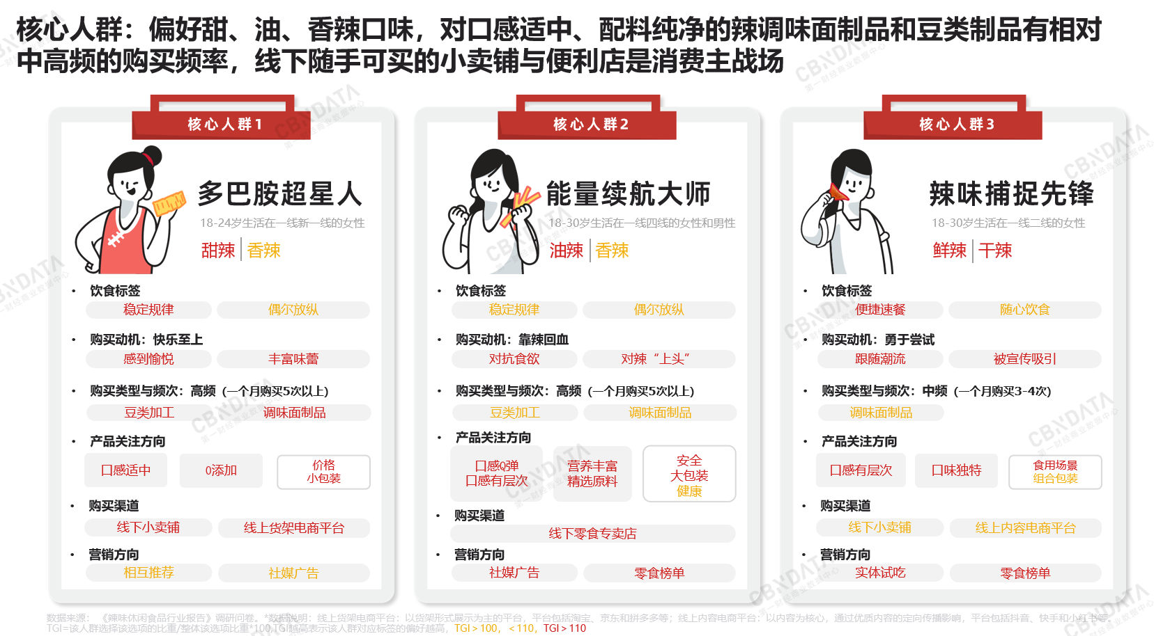 基于情緒價(jià)值、功能價(jià)值以及口味偏好三大維度,《報(bào)告》劃分出六類辣味休閑食品的核心人群。其中規(guī)模最大的群體是將辣味零食作為娛樂載體、享受生活的“多巴胺超星人”,其次是為補(bǔ)充精力而消費(fèi)的“能量續(xù)航大師”以及追求新鮮體驗(yàn)的“辣味捕捉先鋒”。此外,報(bào)告還關(guān)注到注重健康但仍想吃辣的“營養(yǎng)控卡精英”、樂于挑戰(zhàn)重辣口味的“極限挑戰(zhàn)狂人”以及通過辣條回味兒時(shí)味道的“味蕾忠實(shí)信徒”。