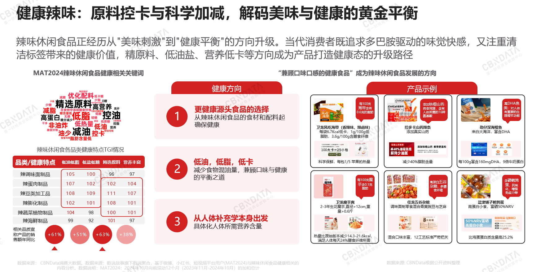 健康辣味正掀起另一波創(chuàng)新熱潮。當(dāng)健康晉升為國家戰(zhàn)略,全民健康意識全面覺醒,辣味零食也需要通過兼容健康與美味為自己正名?!秷?bào)告》指出,低脂、低糖、精選原料、營養(yǎng)豐富已成為辣味零食的主要升級方向,未來,品牌還可從食材源頭、配料組合深入挖掘,在低油、低脂、低卡的配方上精準(zhǔn)平衡。例如,選用像海帶、魔芋這樣的低熱量原料,以配料精簡實(shí)現(xiàn)低卡低脂,包裝采用科學(xué)保鮮技術(shù),打造無負(fù)擔(dān)零食。