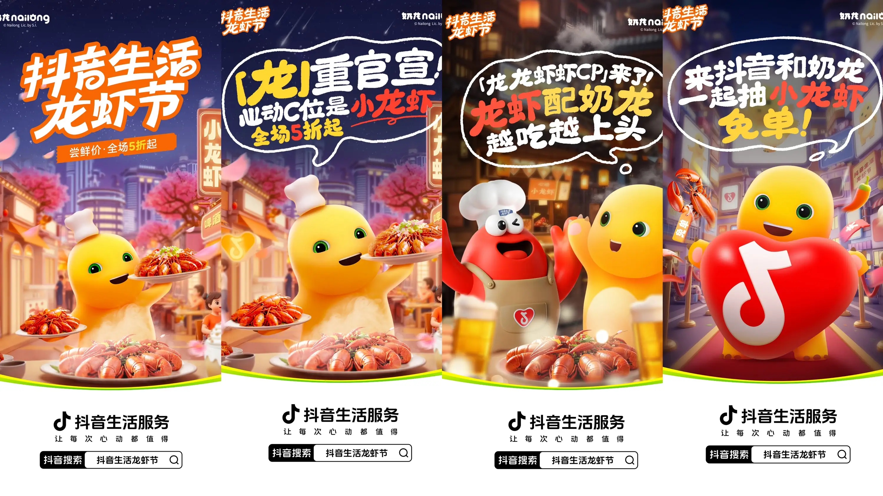 當(dāng)然,與抖音生活龍蝦節(jié)共舞的,遠(yuǎn)不止這兩家品牌。在全國,超過12個(gè)小龍蝦頭部品牌與IP深度合作,共同構(gòu)建線下主題門店;在寧波、武漢等地,龍蝦節(jié)合作商家攜IP登陸核心商圈大屏、向全城滾動(dòng)展示。持續(xù)增加IP和商家影響力的同時(shí),“吃小龍蝦上抖音團(tuán)購”心智,也被進(jìn)一步增強(qiáng)。