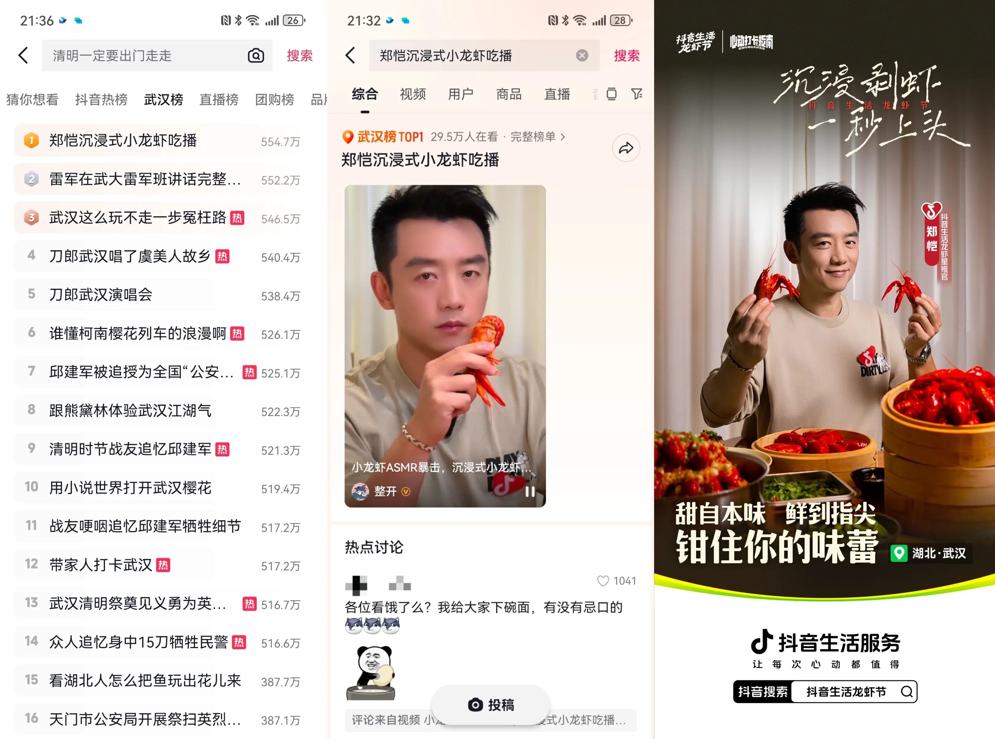 來武漢錄綜藝期間,鄭凱也不忘去撮一頓小龍蝦。在抖音,鄭愷則分享了他的“沉浸試吃蝦vlog”,以ASMR的形式,讓網(wǎng)友“聽見美味”。視頻一經(jīng)發(fā)出,相關(guān)話題#鄭愷沉浸式小龍蝦吃播 沖上全國熱榜TOP2,播放量超480萬次。武漢文旅等賬號(hào)接續(xù)視頻二創(chuàng),掀起一股打卡吃蝦熱。