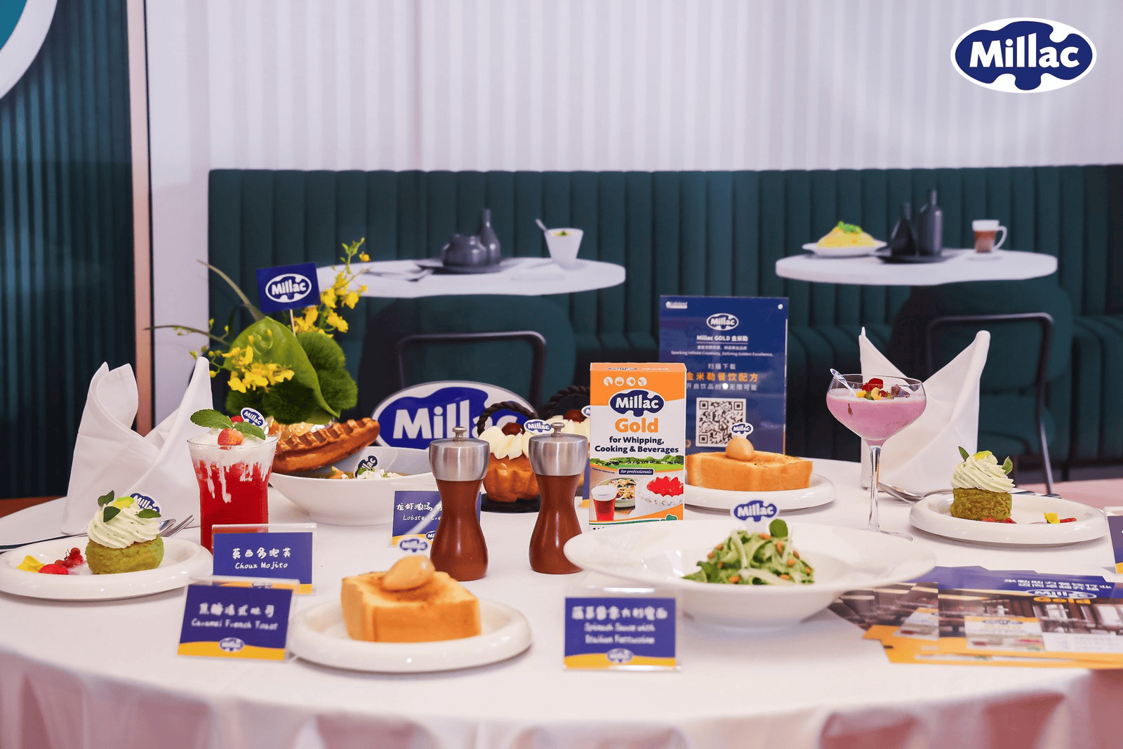 烘焙西點(diǎn)區(qū)打造成甜品店般的氛圍感,陳列由金米勒乳脂精心制作的各式精美甜品,香氣撲鼻,令人垂涎;飲品創(chuàng)制區(qū)則模擬真實(shí)飲品店場景,展示以金米勒為奶基底、為風(fēng)味提升、以及為雪頂裝飾的三款創(chuàng)意飲品,全面詮釋其產(chǎn)品的多元應(yīng)用;餐飲烹調(diào)區(qū)營造出一場精致的晚宴氛圍,呈現(xiàn)由金米勒乳脂制作的龍蝦湯佐面包片和菠菜醬意大利寬面,盡顯其在熱菜中的穩(wěn)定性與風(fēng)味融合力;OEM 定制解決方案區(qū)則全方位展示金米勒在產(chǎn)品定制方面的專業(yè)能力與靈活性,為品牌客戶帶來量身打造的創(chuàng)新解決方案。