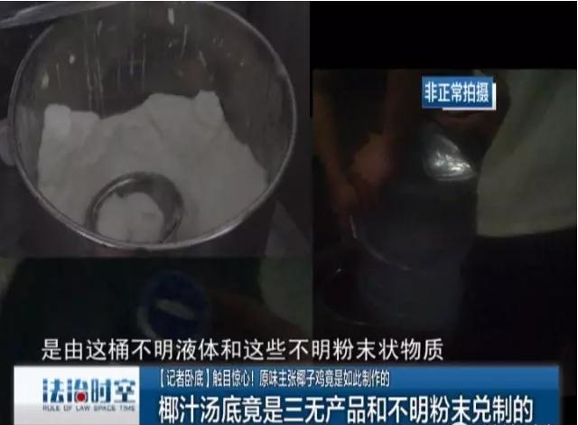 昨日,有記者暗訪“原味主張椰子雞”深圳益田高發(fā)城池店,發(fā)現(xiàn)其售賣的椰子雞湯中其實(shí)并不含椰子汁,所謂的原味椰汁其實(shí)是由不明粉末狀物質(zhì)和三五產(chǎn)品勾兌而成。
