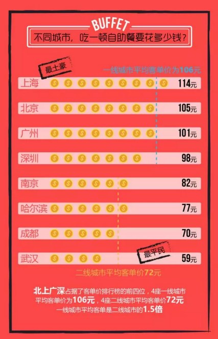 不光是自助餐這一業(yè)態(tài),縱觀餐飲業(yè),客單價和成本控制之間的關(guān)系是一家餐廳是否擁有持續(xù)經(jīng)營力的重要因素。八大城市自助餐客單價數(shù)據(jù)顯示,一線城市自助餐平均客單價為106元,二線城市平均客單價為72元??紤]到酒店高端自助餐的市場份額,實(shí)際上其他自助餐的平均客單價要低于這一水準(zhǔn)。
