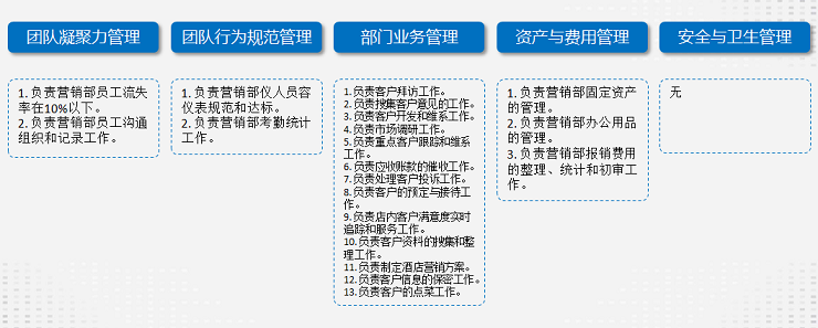 原因是這份職責表沒有具體指定由誰來做或負責哪些事情。而一份詳盡的部門職責表必須要從“團隊凝聚力管理”、“團隊行為規(guī)范管理”、“部門業(yè)務(wù)管理”、“資產(chǎn)與費用管理”及“安全與衛(wèi)生管理”等多個角度來考慮。首先,部門是由人構(gòu)成的,團隊建設(shè)是每個部門的基礎(chǔ)!每個部門把人凝聚起來,整個餐廳才能有凝聚力。其次,團隊穩(wěn)定的同時,要有一定的制度去規(guī)范。規(guī)范的團隊才有戰(zhàn)斗力,所以部門職能的第二項準則就是對團隊行為規(guī)范的管理。然后就是部門的業(yè)務(wù)管理,也就是部門具體負責企業(yè)或餐廳哪些業(yè)務(wù) 。再次部門運作當然會涉及到部門的資產(chǎn)與費用管理。最后食品安全是餐飲行業(yè)的重中之重,因此餐廳的安全與衛(wèi)生管理非常重要。