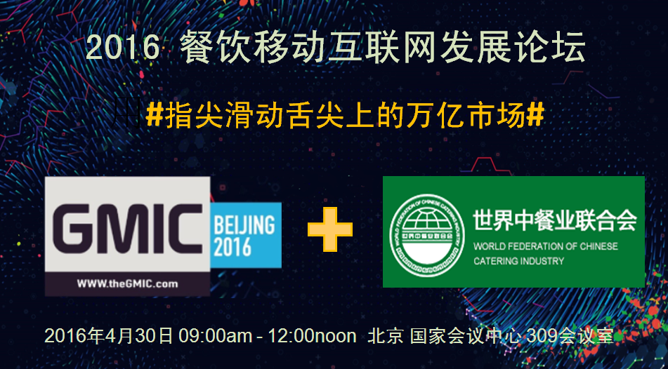 全球最具影響力的移動(dòng)互聯(lián)頂級(jí)盛會(huì)2016 “全球移動(dòng)互聯(lián)網(wǎng)大會(huì)”(GMIC)將于2016年4月28日-30日在國(guó)家會(huì)議中心舉辦。本屆GMIC的亮點(diǎn)之一是將“移動(dòng)互聯(lián)+”推展到了“舌尖”之上。為更好地探索餐飲業(yè)與移動(dòng)互聯(lián)網(wǎng)的深度融合,探尋“指尖滑動(dòng)舌尖上的萬(wàn)億市場(chǎng)“,世界中餐業(yè)聯(lián)合會(huì)攜手GMIC及國(guó)家會(huì)議中心,于2016年4月30日在國(guó)家會(huì)議中心共同舉辦“2016餐飲移動(dòng)互聯(lián)網(wǎng)發(fā)展大會(huì)”。