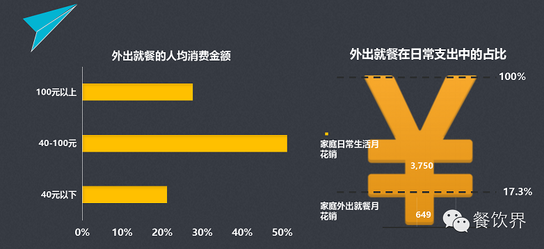 數(shù)據(jù)顯示,食客外出就餐人均消費(fèi)主要集中在40-100元區(qū)間,家庭外出就餐月花銷約為649元,約占家庭日常生活月支出的17.3%。