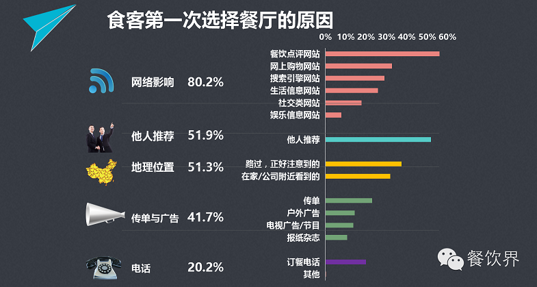 數(shù)據(jù)顯示,在消費(fèi)者選擇陌生餐廳就餐的5大原因中,超過8成的消費(fèi)者會(huì)受網(wǎng)絡(luò)影響;超過五成的人會(huì)將他人推薦和地理?xiàng)l件作為考量標(biāo)準(zhǔn)。