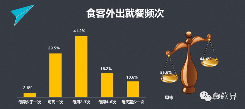 數(shù)據(jù)顯示,超過40%的食客外出就餐的頻率為每周2-3次;食客在周末外出就餐的情況稍多于工作日期間。