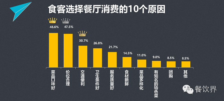 在影響食客上門消費(fèi)的10個(gè)原因中,超過4成的消費(fèi)者認(rèn)為菜品口味和價(jià)格合理是最重要的原因;其次,則是交通便利和衛(wèi)生條件。