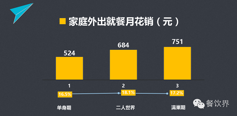 外出就餐金額隨家庭生命周期而遞增外出就餐人均花銷與家庭月總花銷都隨家庭生命周期而遞增;外出就餐在家庭日常生活月花銷中的占比在二人世界時(shí)略高。