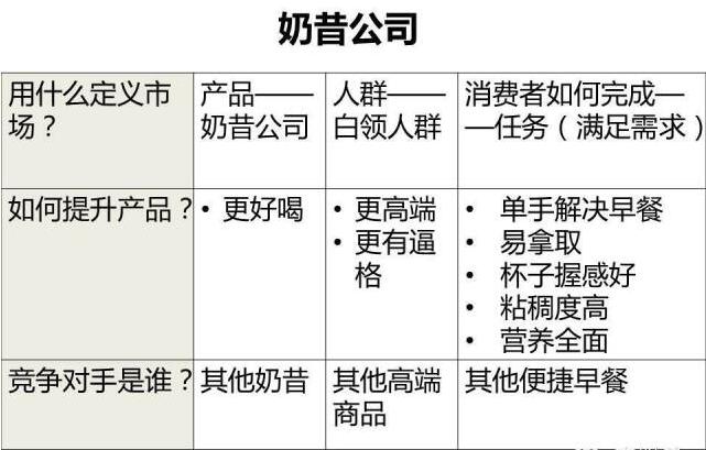 應(yīng)該按照“你的產(chǎn)品如何滿足用戶需求”來定義市場,而不是單純用自己的標(biāo)準(zhǔn)來假想一個(gè)市場。(比如奶昔定位成“幫早上開車上班的人,單手解決早餐”這個(gè)市場。)