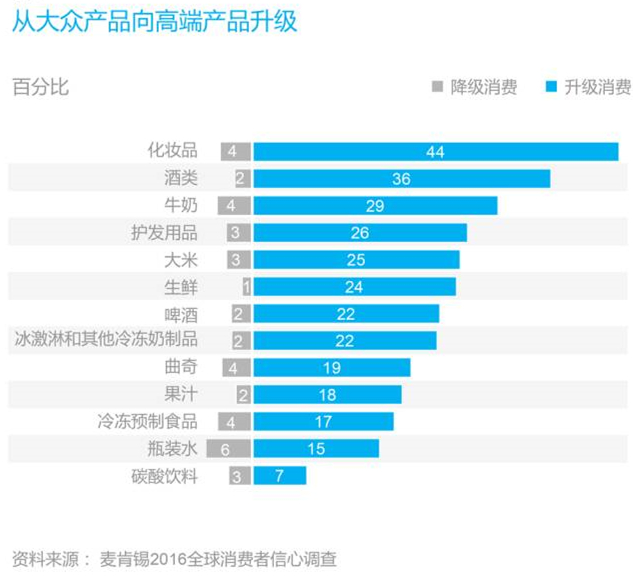 消費升級正呈現(xiàn)出旺盛的勢頭和活力,高端產品的品類增速超過了大眾產品和價值型產品的品類。而消費量—尤其是食品和飲料——則增長乏力。