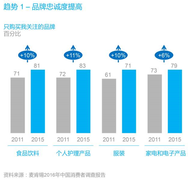 越來越多的中國消費者開始只關注少數(shù)幾個品牌,其中一些人則進一步鎖定某一個品牌。中國消費者并不很愿意在自己關注的品牌之外購買其他品牌。例如在服飾品類,愿意選擇備選品牌之外的消費者比例,已經從2011年的約40%降至2015年的不足30%。