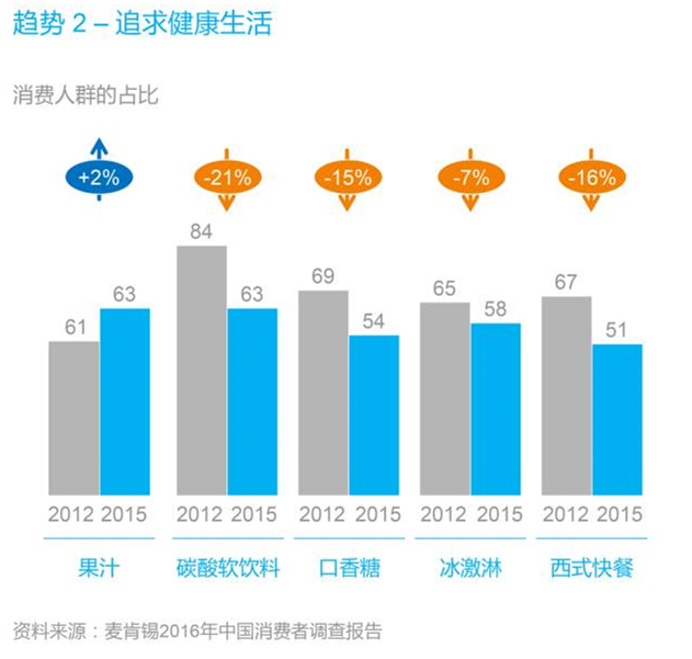 一個新的現(xiàn)象是,超過50%的消費者偏愛健康和營養(yǎng)食品。其中,果汁普及率提升了2%,而非健康類食品的普及率有所下降:碳酸飲料下降了21%,口香糖下降了15%,西式快餐則下降了16%。
