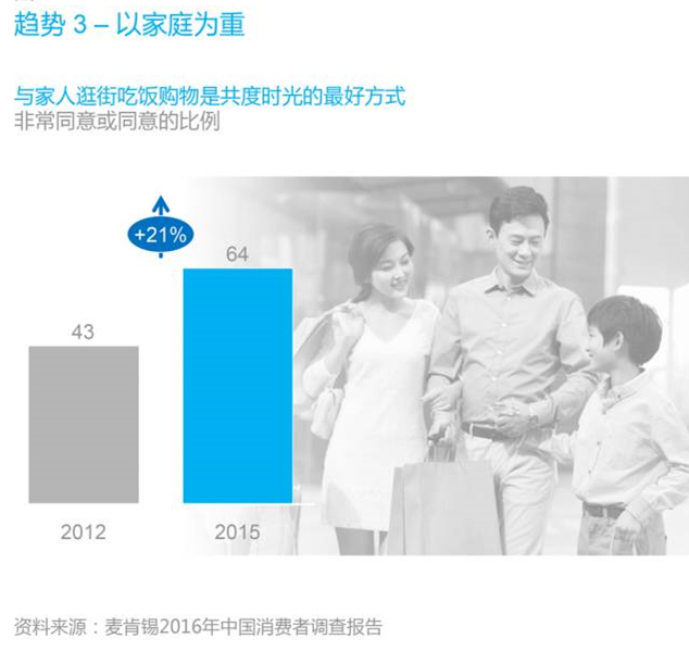 這一趨勢為消費品行業(yè)帶來了深遠的影響。盡管電子商務風生水起,“購物休閑體驗(retailtainment)”卻越來越吸引著人們。三分之二的消費者表示,逛街吃飯購物是與家人共度時光的最好方式,與3年前相比上升了21%。