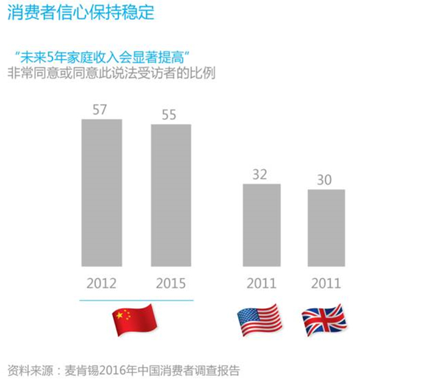 當被問及未來收入預期時,55%的受訪者相信未來五年中自己的收入將顯著增長,較2012年僅下降2個百分點。相比美國和英國,2011年持這一說法的消費者分別為32%和30%。