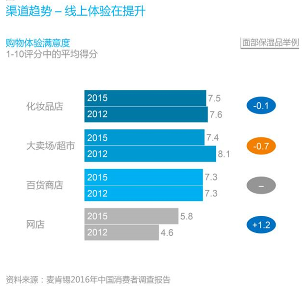 消費者對實體店的滿意度仍然比在線渠道高,但隨著網購越來越受歡迎,線上和線下渠道的滿意度差距正在縮小。