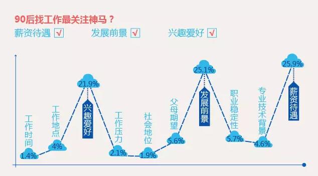 90后中,有83.5%的人表示不在乎加班。在找工作時(shí),90后對(duì)工作時(shí)間關(guān)注度僅為1.4%,對(duì)社會(huì)地位的關(guān)注度僅為1.9%,位列前三的影響因素依次為:薪資待遇、發(fā)展前景、興趣愛(ài)好。