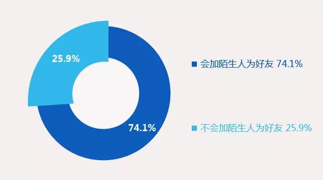 974.1%的90 后會(huì)在即時(shí)通訊軟件中,加陌生人為好友,25.9%不會(huì)加入陌生人。