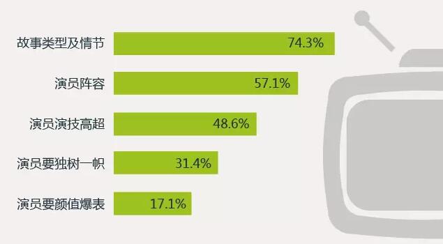 77.1%的90后觀(guān)眾認(rèn)為一部?jī)?yōu)秀的電視劇大約在 10-30集最合適,恰好一部美劇的長(zhǎng)度一般25集左右。在演員方面,48.6% 的90后認(rèn)為演員演技高超最重要,31.4%認(rèn)為演員要有自己的風(fēng)格,17.1%的認(rèn)為演員一定要顏值爆表。