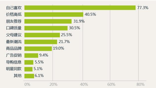 2在日常購(gòu)物時(shí),77.3%的90后會(huì)注重自己是否喜歡, 40.5%會(huì)關(guān)注價(jià)格高低,31.9%會(huì)受到朋友推薦的影響。
