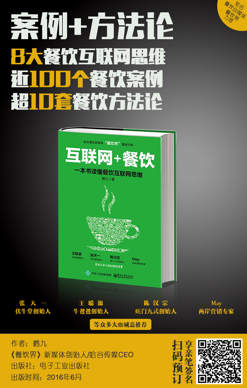 6月6日起,《“互聯(lián)網(wǎng)+餐飲”:一本書讀懂餐飲互聯(lián)網(wǎng)思維》將于線上正式開啟預(yù)售。伏牛堂創(chuàng)始人張?zhí)煲弧⑴0职謩?chuàng)始人王聰源、蠔門九式創(chuàng)始人陳漢宗、兩岸營銷專家MAY等眾多大咖熱薦的誠意之作,跟上互聯(lián)網(wǎng)的步伐刻不容緩!趕緊掃描二維碼參與預(yù)定吧!