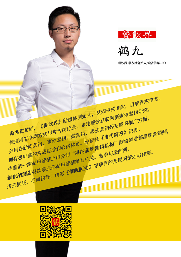 作為知名餐飲自媒體人,“餐飲界”創(chuàng)始人鶴九將自己親身經(jīng)歷的經(jīng)驗(yàn)與知識進(jìn)行系統(tǒng)的梳理,并對多年總結(jié)而來的餐飲互聯(lián)網(wǎng)思維精華進(jìn)行了提煉,撰寫了《“互聯(lián)網(wǎng)+餐飲”:一本書讀懂餐飲互聯(lián)網(wǎng)思維》一書。