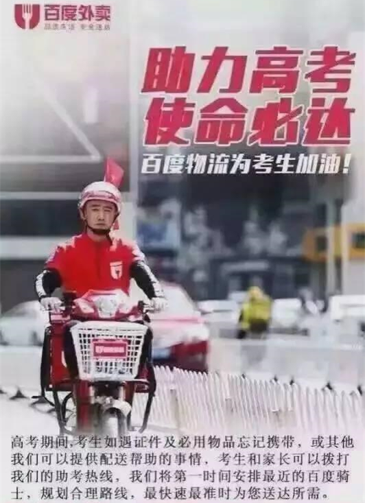 正如歷年來推行的高考愛心專車,百度外賣抓住了高考期間的痛點(diǎn),而自身恰好擁有解決痛點(diǎn)的方法,于是在這重要的兩天里,百度騎士們仿佛就是為高考而存在的群體,讓百度外賣成功地融入熱點(diǎn)。