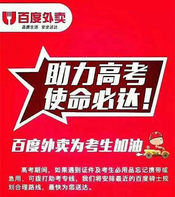 百度外賣對(duì)外宣稱,今年高考期間將全線助力,凡是遇到證件及考生必用品忘記攜帶或急用,可撥打百度外賣的助考專線,服務(wù)中心將安排最近的百度騎士規(guī)劃合理路線,以最快的速度為考生送上遺漏物品。