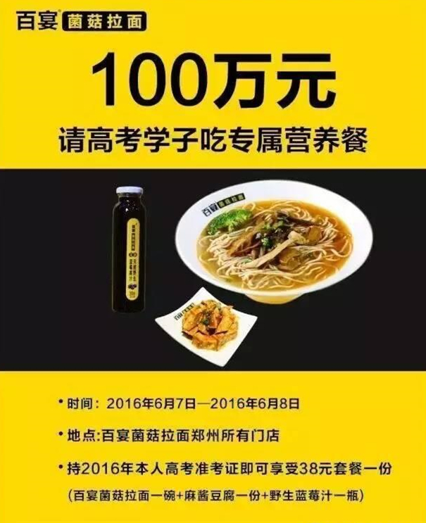 正如今年“高考”期間,鄭州的百宴菌菇拉面為了助力高考學(xué)子能在考試期間獲得足夠的營(yíng)養(yǎng),特別制定和搭配了高考學(xué)子專屬的營(yíng)養(yǎng)套餐。據(jù)說這種營(yíng)養(yǎng)的王牌搭配,能夠充分滿足考生的營(yíng)養(yǎng)需求,還能長(zhǎng)時(shí)間保持充沛體力,為此能讓考生以最佳身體狀態(tài)參與重要“戰(zhàn)役”。