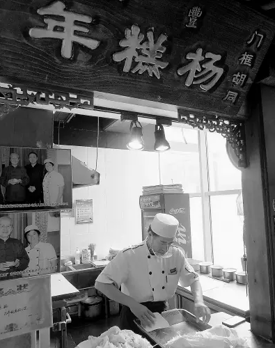 “門框胡同?。课矣袔资隂]回去過了。”55歲的楊啟鋼,是“年糕楊”的第三代傳人。現(xiàn)在,他和已經(jīng)退休的哥哥姐姐一起,在豐臺(tái)區(qū)的中華萬豐小吃城經(jīng)營著十幾平方米的“年糕楊”小吃檔口。大約120年前的清光緒年間,楊啟鋼的爺爺楊殿華,正是在門框胡同打響了“年糕楊”的名號(hào)。