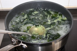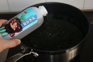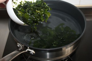 4、湯鍋中放入適量的水,倒入泡好的裙帶菜。