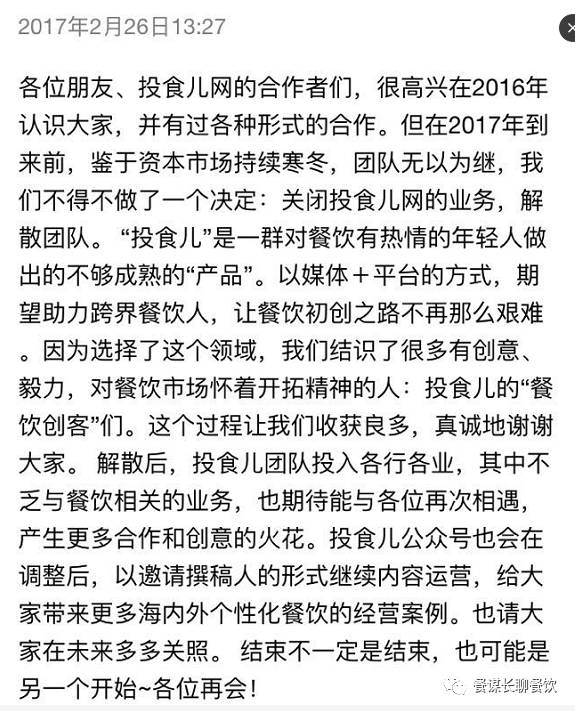 餐謀長 導(dǎo)讀:昨日,餐飲創(chuàng)業(yè)者內(nèi)容分享平臺 " 投食兒 " 微信公眾號發(fā)出公告,宣布項目關(guān)停,團(tuán)隊解散。公眾號會在調(diào)整之后,以邀請撰稿人的形式繼續(xù)內(nèi)容運營。