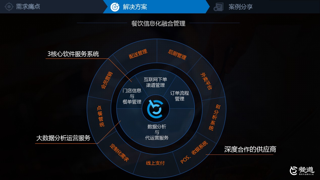 從餐飲企業(yè)信息化轉(zhuǎn)型的需求痛點(diǎn)到探討如何解決,再結(jié)合案例分析,餐道向一眾來(lái)賓展示了餐飲信息化融合管理解決方案,其產(chǎn)品服務(wù)涉及餐廳日常經(jīng)營(yíng)的各大主要環(huán)節(jié)。
