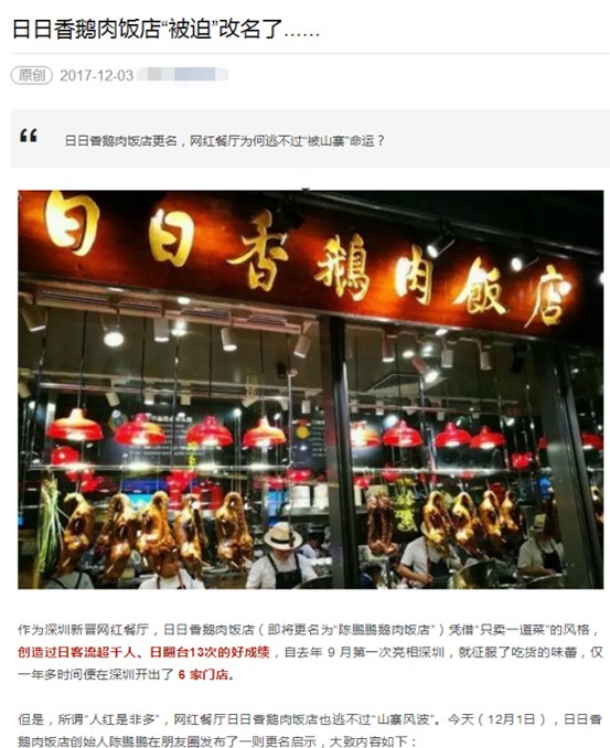 消息稱,深圳新晉網(wǎng)紅餐廳“日日香鵝肉飯店”因飽受山寨和跟風(fēng)的困擾,自稱品牌“創(chuàng)始人”的陳某決定正式更換品牌名稱,并在其朋友圈進(jìn)行聲明。消息傳出后,部分餐飲媒體進(jìn)行跟風(fēng)報(bào)道,迅速在圈內(nèi)流傳開來(lái)。