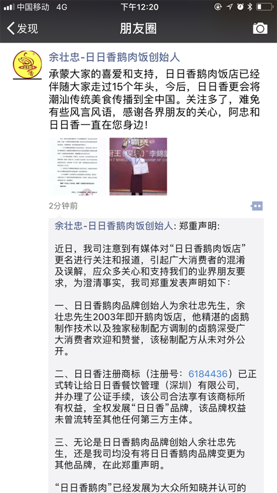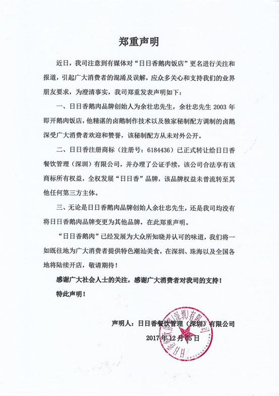 聲明來(lái)自于“日日香鵝肉飯店”真正的創(chuàng)始人余壯忠。聲明稱,余壯忠為日日香鵝肉飯店品牌創(chuàng)始人,現(xiàn)已經(jīng)將日日香商標(biāo)正式轉(zhuǎn)讓給日日香餐飲管理(深圳)有限公司。目前,日日香品牌并沒有任何更名的計(jì)劃。未來(lái),“日日香”品牌將全面發(fā)展,并即將在深圳、珠海以及全國(guó)各地陸續(xù)開店。